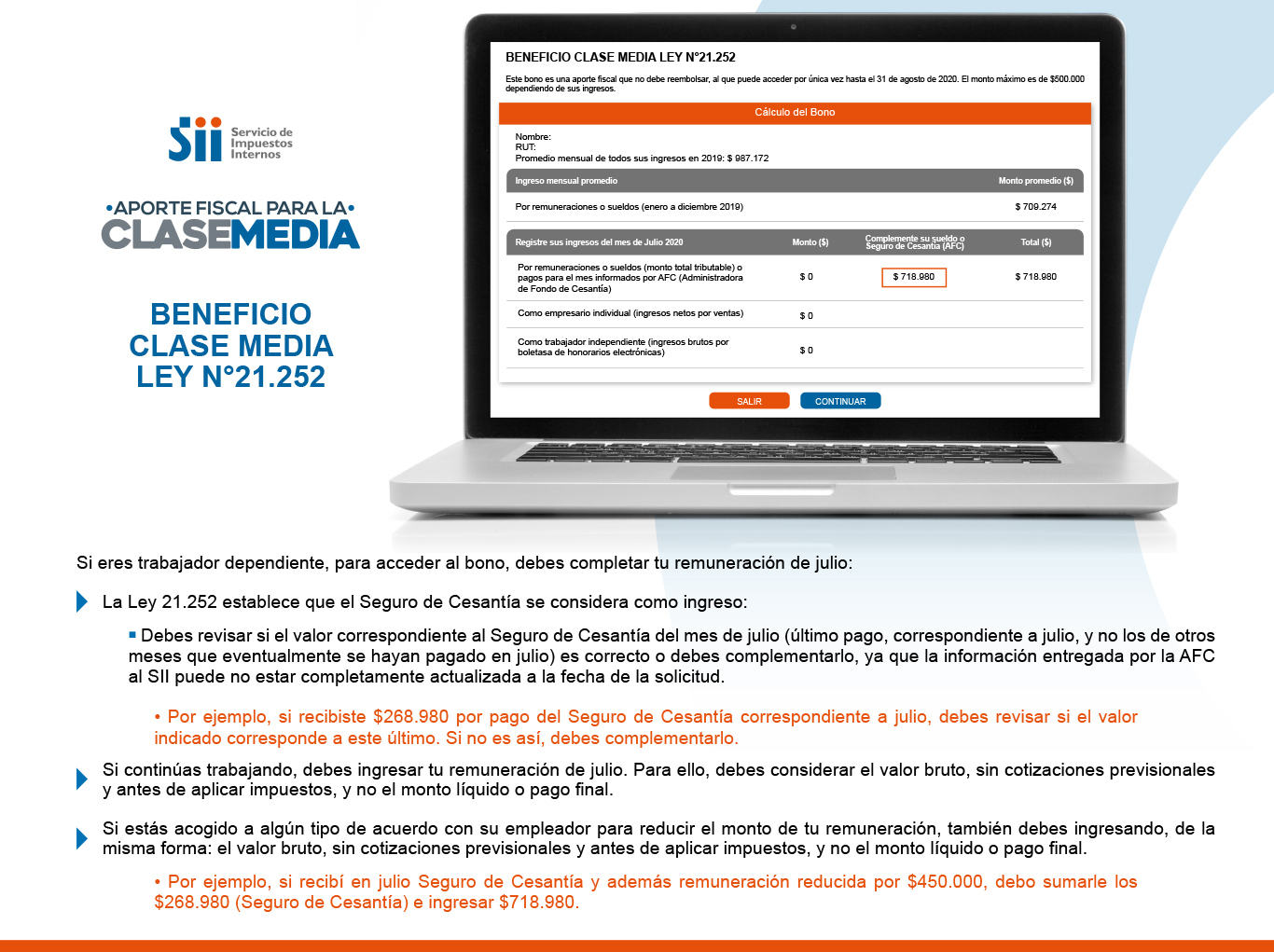 Al ingresar mi solicitud bono clase media me dice que no califico ya que no presento renta el año 2019actualmente estoy afp capital con mis cotizaciones al dia sii bono. Hace solo algunos días el gobierno anunció la entrega de un nuevo paquete de ayuda económica.
